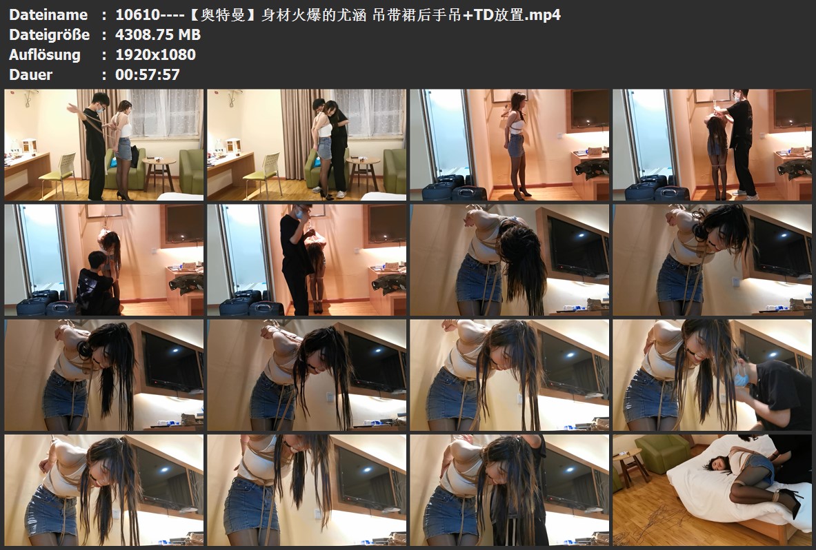身材及其火辣的尤涵,带裙胸前的一对大灯已经快呼之欲出了。尤涵不仅身材好柔韧性和耐力都不错,给模特欧式直臂紧缚后手吊起来,再戴上大号口球放置,身前再用绳子牵引强制弯腰,尤涵就这么被束缚的动弹不得。事前在模特身上的某个地方放了一个小彩蛋,绑好之后就把它遥控打开,尤涵被刺激的口水像瀑布一样就流下来了