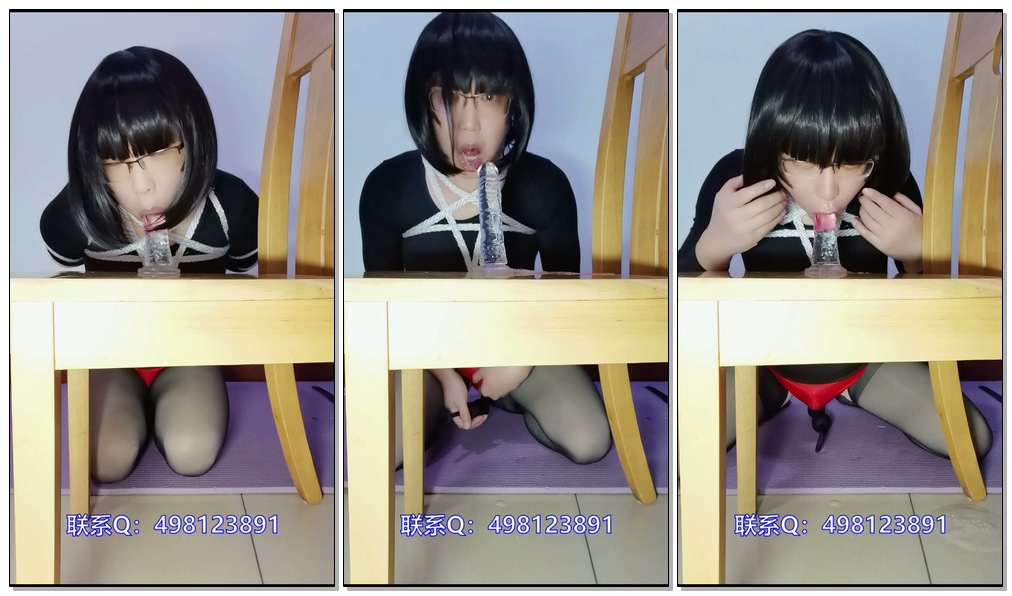 征得主人的同意后,把五花绑绳解开,留下五星缚,这样小M能更好的调整姿势来吃大棒子。