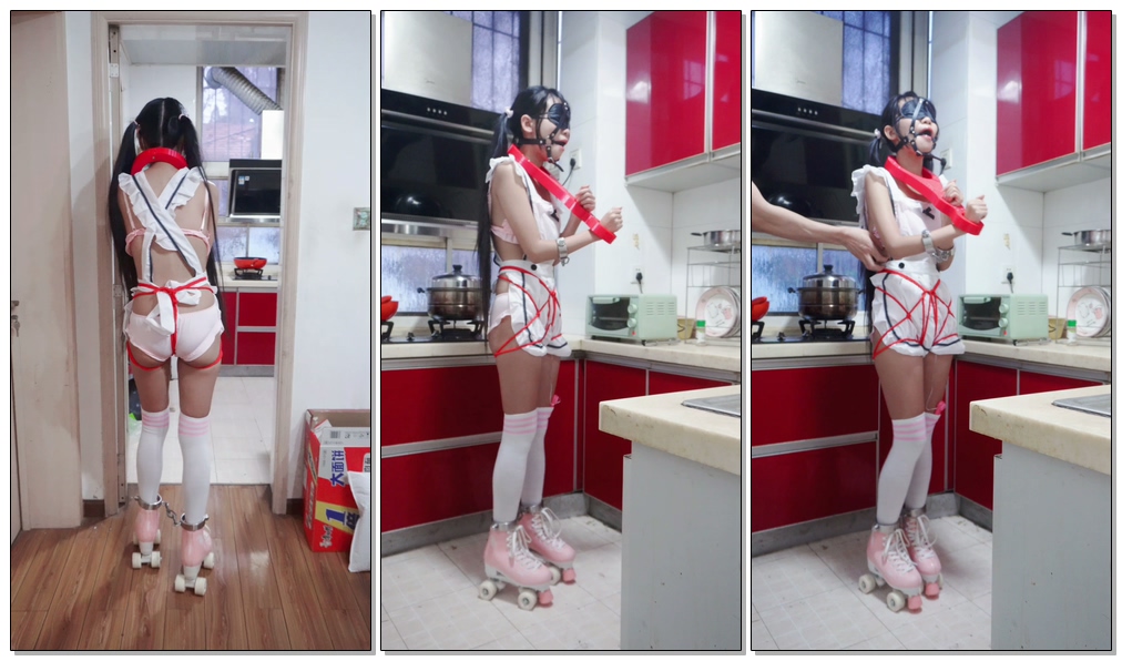 冷酱穿可爱情趣女仆装,轮滑鞋,戴着颈手枷,脚镣,捆绑股绳