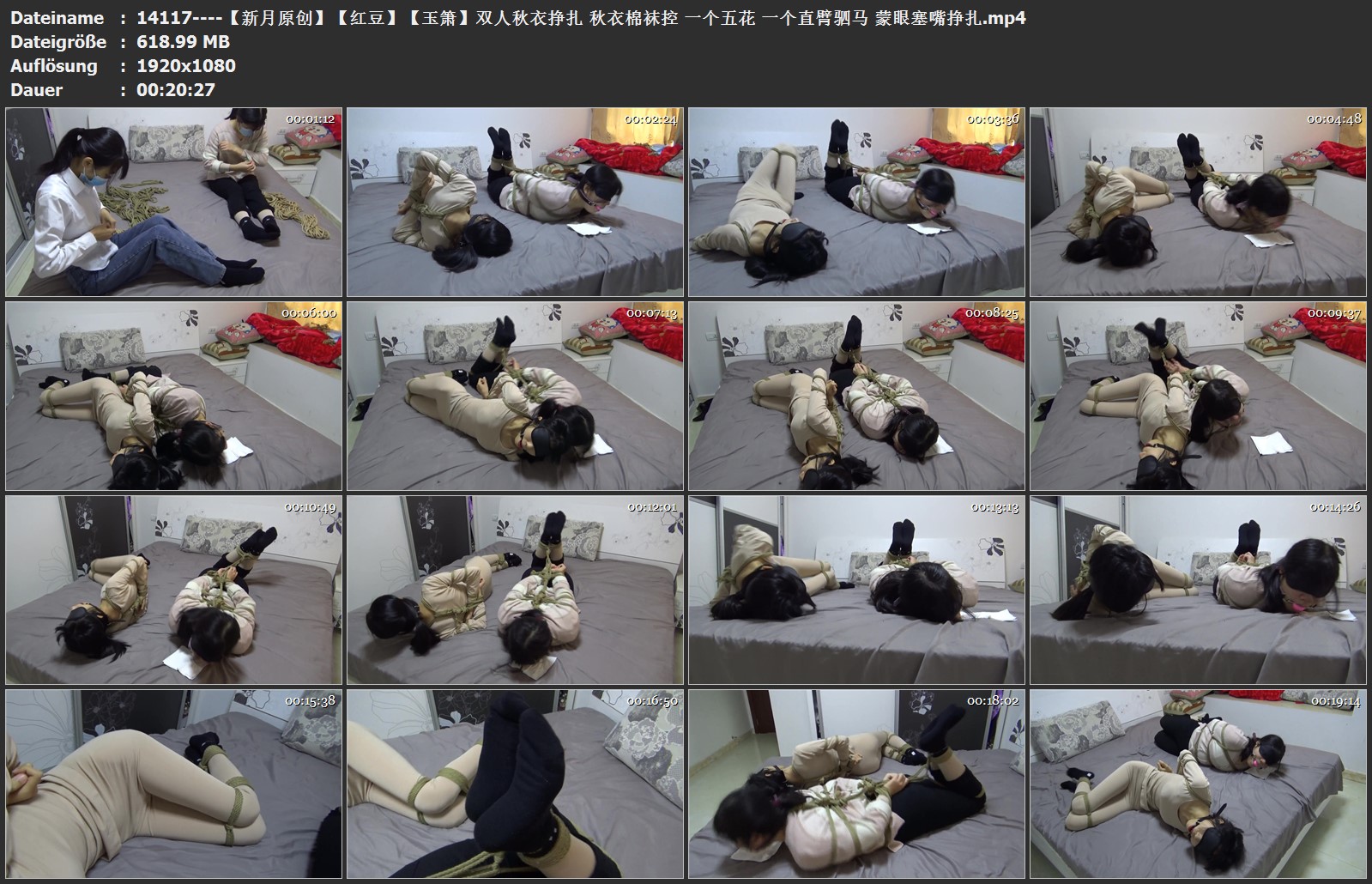 红豆和玉箫一起脱掉外衣,穿着秋衣棉袜的她们,红豆五花绑,玉箫直臂驷马,两人蒙眼塞嘴之后,丢在床上挣扎,自生自灭