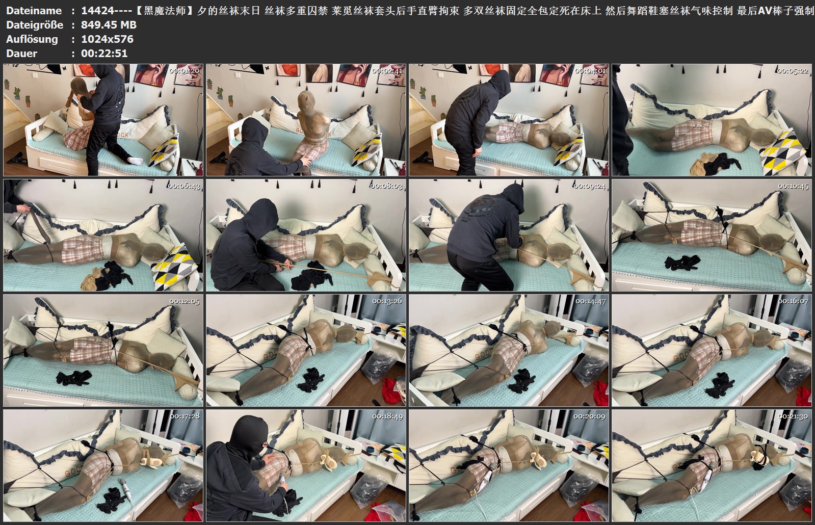 【黑魔法师】夕的丝袜末日 丝袜多重囚禁 莱觅丝袜套头后手直臂拘束 多双丝袜固定全包定死在床上 然后舞蹈鞋塞丝袜气味控制 最后AV棒子强制GC