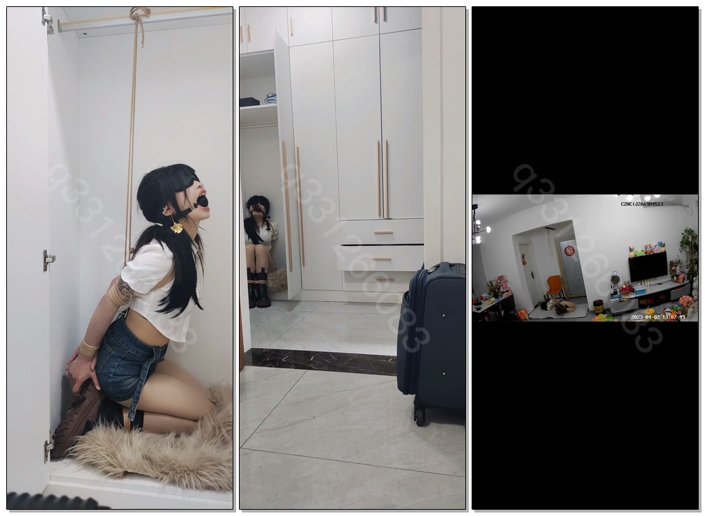 最近大叔是真的爱上了各种捆绑放置,这次大叔可是手下留情了,没像上次那样放置丫丫8个小时,不过这样的驷马放置8小时是个人应该都受不了的,所以,柜子里的放置和客厅的驷马吊缚放置各一个小时吧,不然解开之后地上一瘫又啥也做不了了!柜子里放不了监控,所以是手机画面,客厅驷马放置是监控画面,剪切出来一部分供大家欣赏