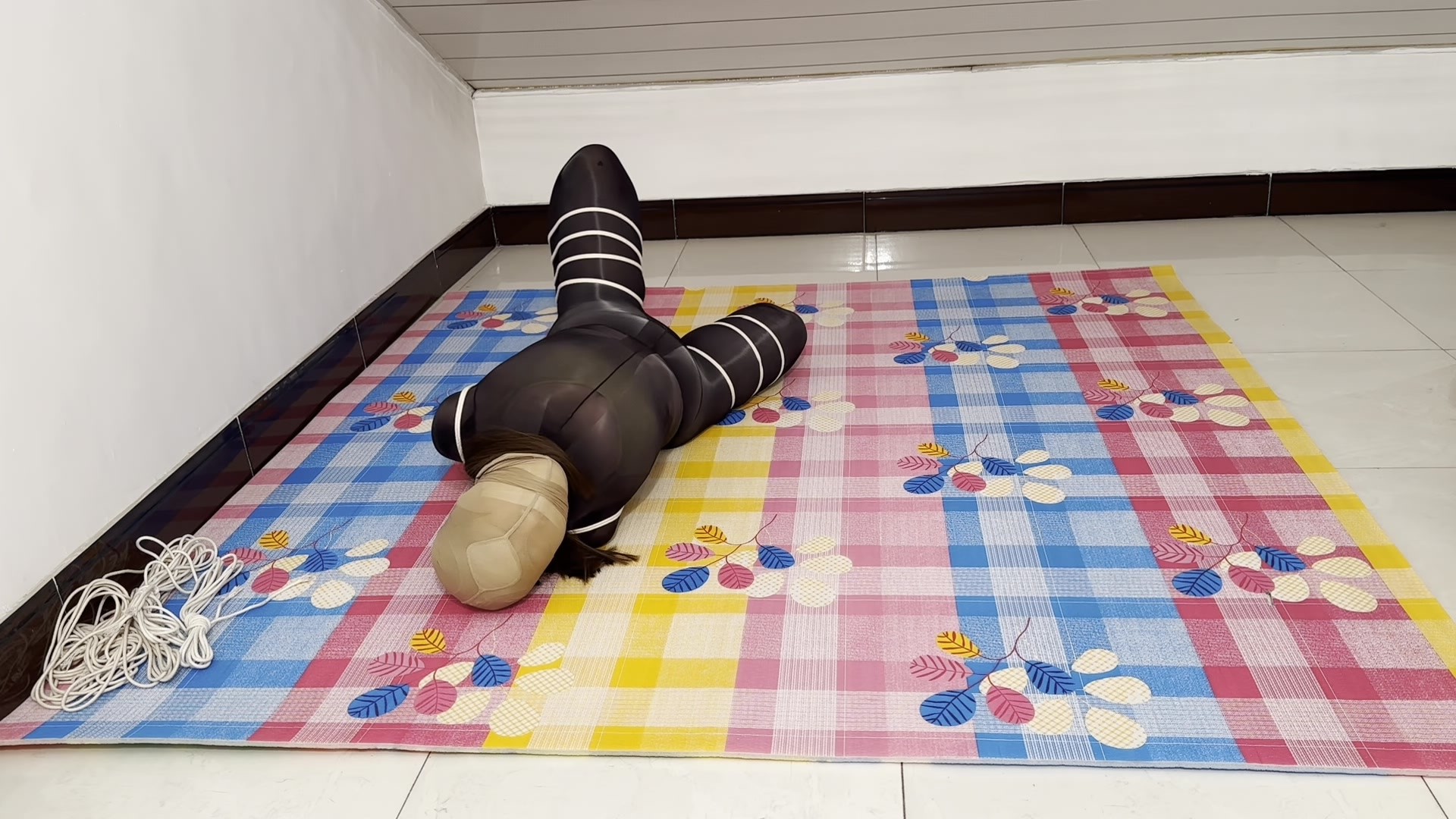 【M妻】被吊绑在储藏间里的肉货(连身黑丝+白袜、丝袜套头、胶带堵嘴蒙眼、项圈)