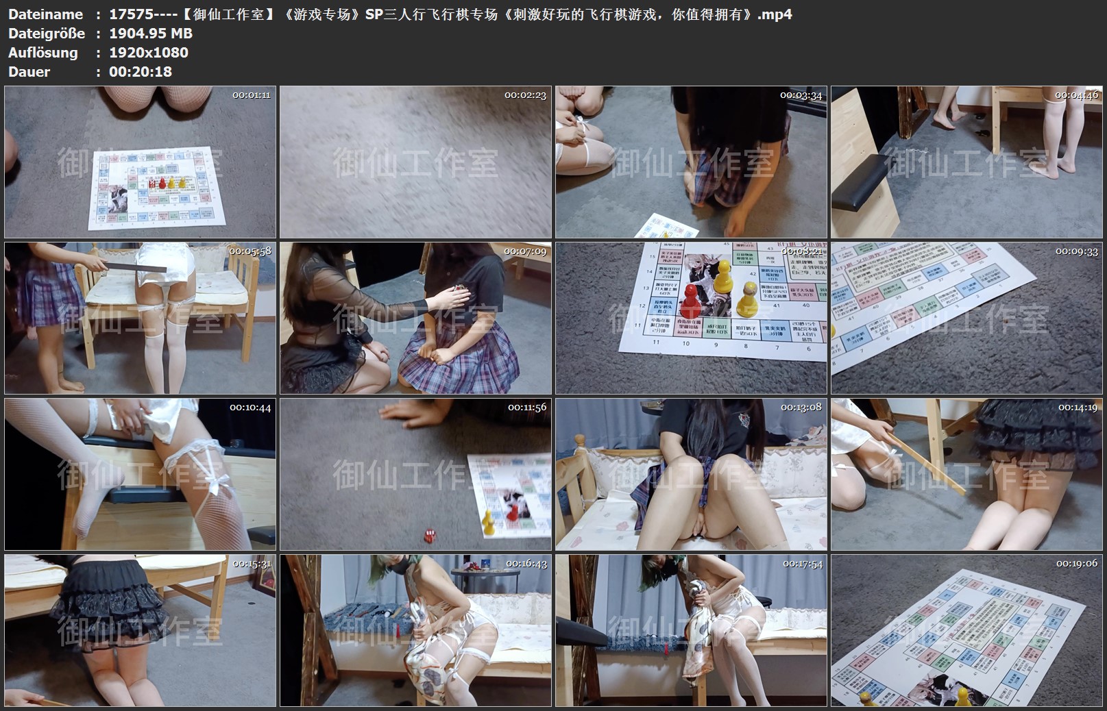此次为御仙工作室的游戏专场,我们的模特参与者有,小鹿,珺珺,小馨。三个人通过飞行棋游戏的方式来比拼谁是第一次,当然好玩刺激的飞行棋每走一步都会有一个对映的惩罚,有的被SP,打通红的屁股,有的被牙签扎坏的美胸,还有一直 呻吟不停的。