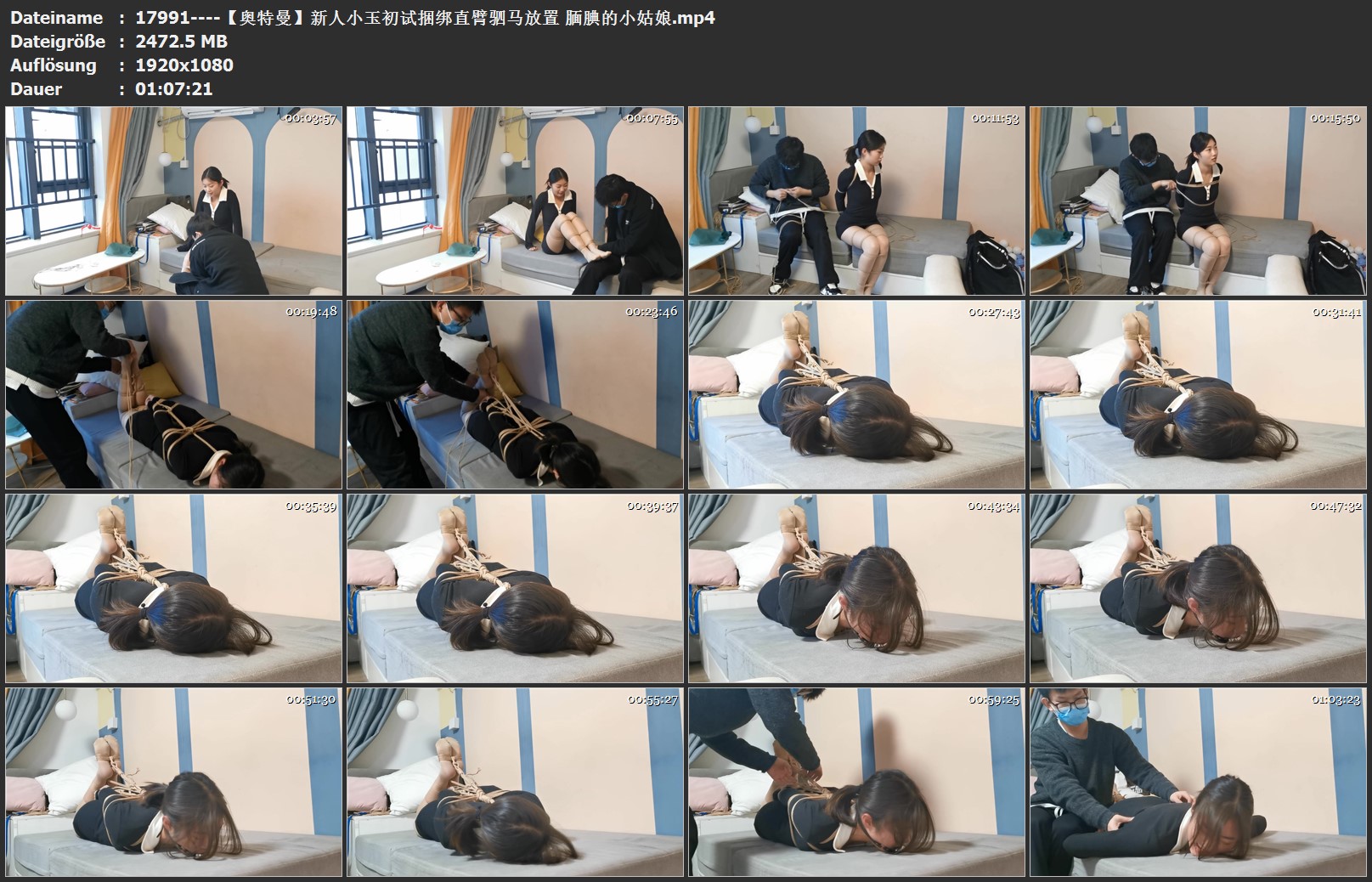 新人小玉,小姑娘还是比较可爱的,性格很腼腆,一开始说自己柔韧性可以,被绑上了直臂驷马就后悔了,被堵嘴了又不吭声,最后解开的时候已经在默默流眼泪了