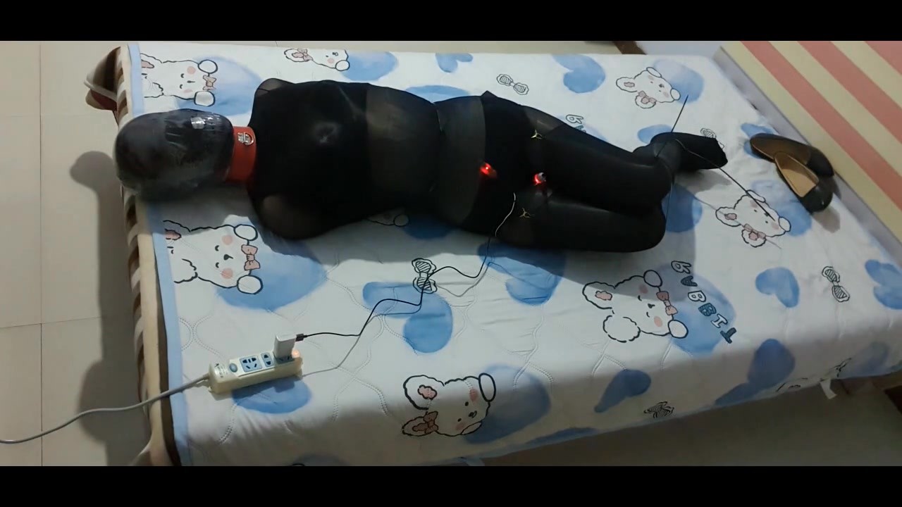 重新穿好吊带丝袜紧身衣 戴上胸部震动器后扎带固定 然后又套了层热缩微孔(这次贴了胶布孔更小了) 剪刀放到带锁箱子里后用定时锁上锁 这次录到定时锁开锁 扎带手铐勒的太紧把手腕勒伤了 剪开的时候废了好一会 之后又玩了玩 热缩由于汗浸透呼吸十分困难又贴了层胶布