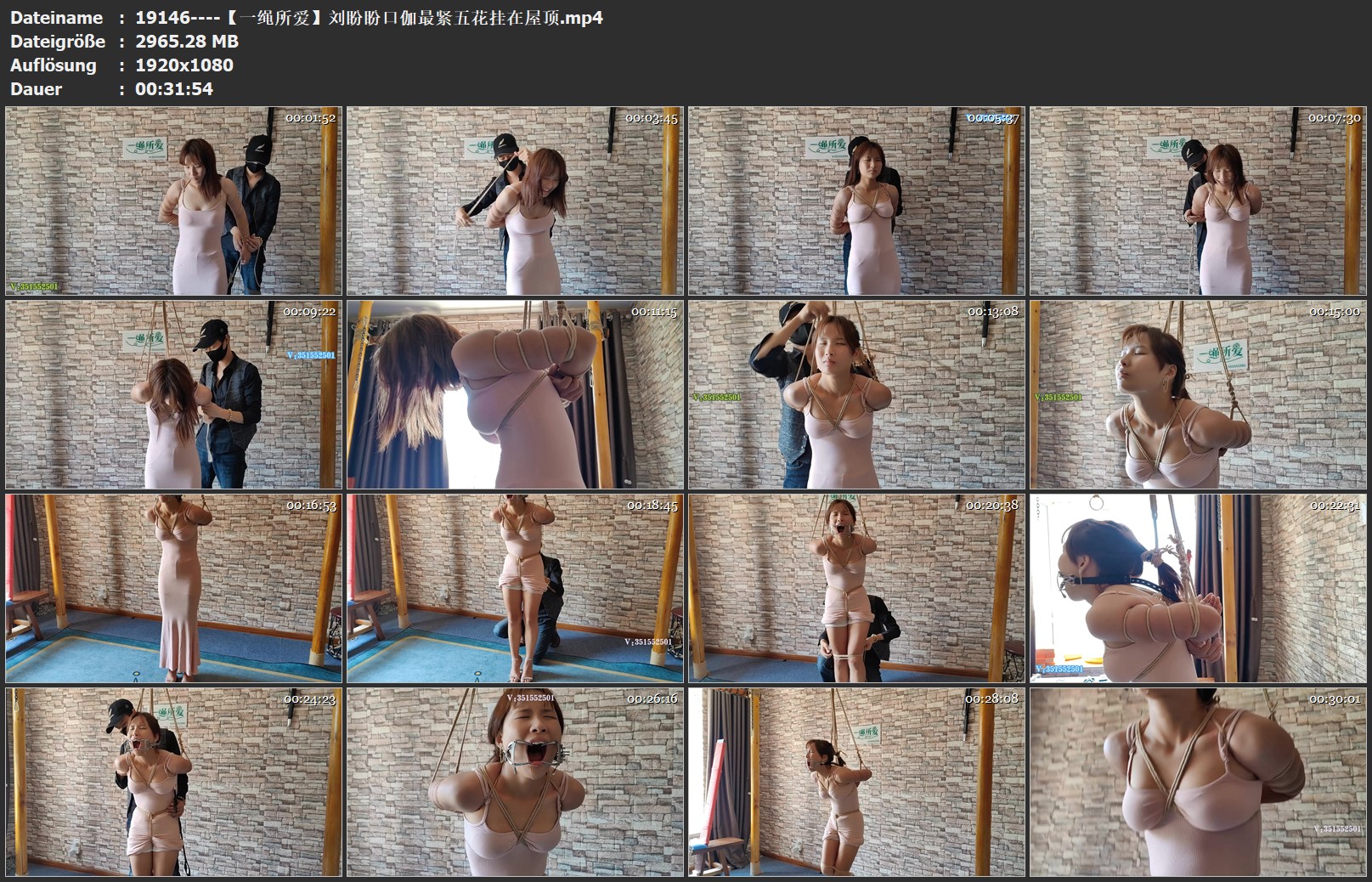 刘盼盼最紧的五花大绑,麻绳勒紧皮肤里,嘴巴被金属口伽强迫张开,头发被麻绳紧紧绑住迫使盼盼被迫仰头,口水不自觉的流出,还要承受被鞭打欺负,最后时刻可以看得出来她身体到了承受极限,已经明显受不了了,但是仍然没有被松绑