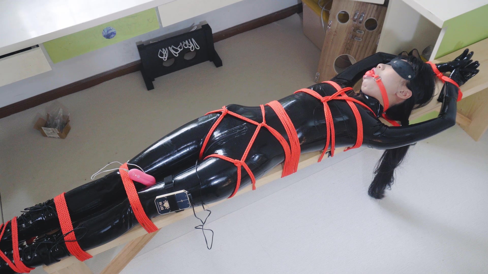 全身乳胶衣,芭蕾鞋,绑在屋子中间的长凳上,一开始没有带口球只有眼罩,中途塞上口球,随着震动以及电击的增强,冷酱不断扭动身体发出呜咽的声音(虽然捆绑导致可挣扎的空间不大)