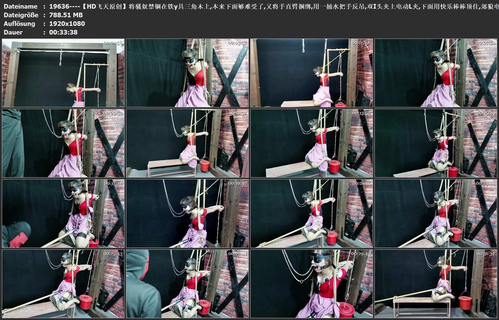 【HD飞天原创】将骚奴禁锢在铁y具三角木上,本来下面够难受了,又将手直臂捆绑,用一捅水把手反吊,双I头夹上电动L夹,下面用快乐棒棒顶住,郊狼电击,口夹带上,夹住舌头,鼻勾夹住鼻子到上...