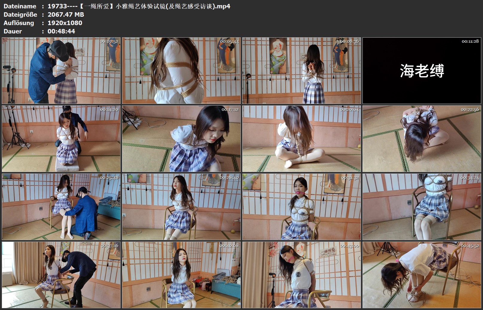 小雅试镜第一次体验绳艺,接受程度很高,先是绑上后手观音,后给他绑上一个标准日式之后绑成海老缚拉得非常紧,自己拼命挣扎但是无济于事,坚持了段时间才解开,解开海老缚后讲脚裸和脚膝用单独的绳子绑紧后拿上口球给小雅戴上,不一会儿口水就只不住的流了出来,最近绑了一个很紧的直臂到拍摄结束(最后结尾是对模特本次绳艺体验感受的访谈)