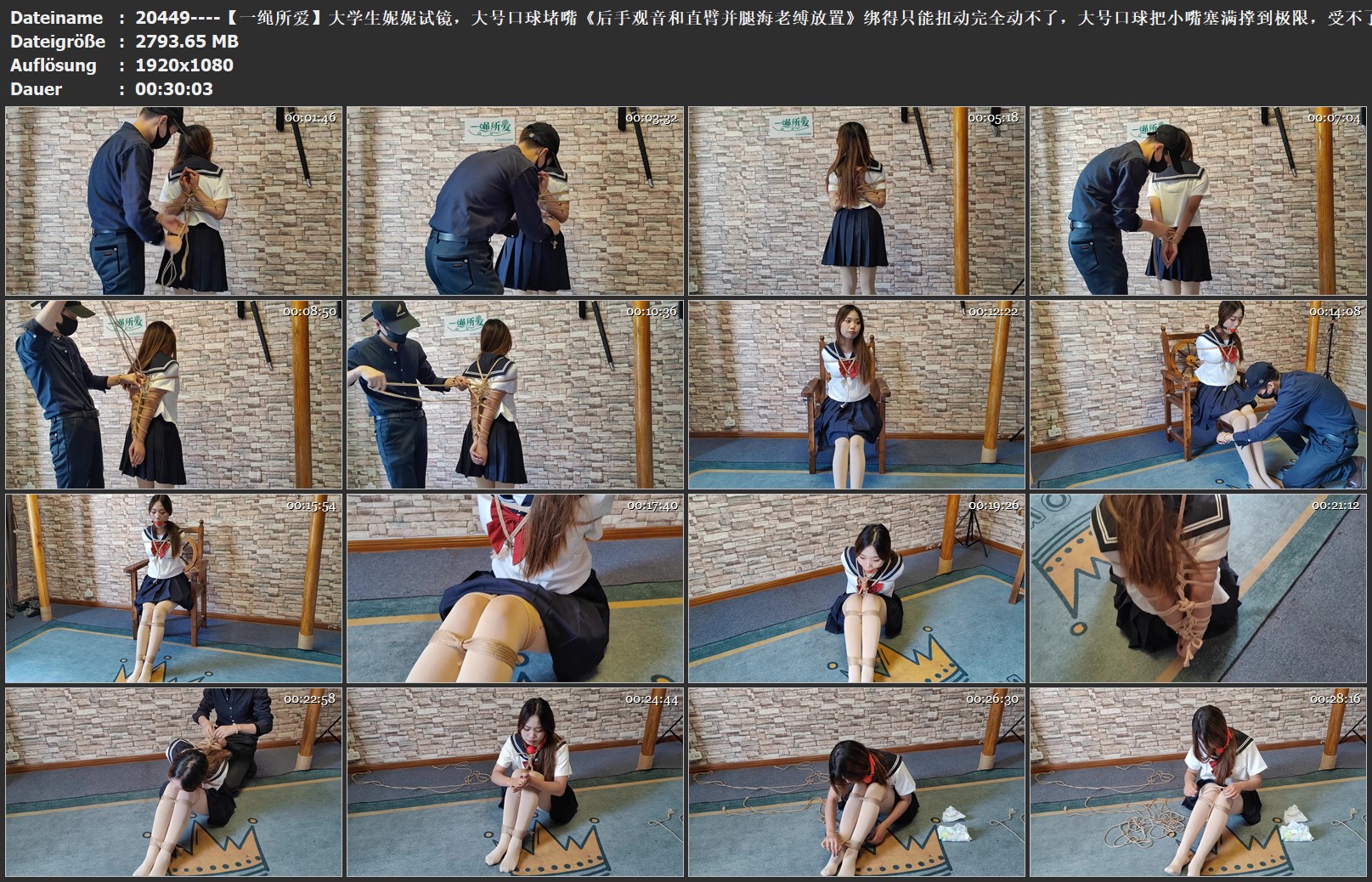 新模大学生妮妮,长得非常好看,配合度也是非常高,先是绑上后手观音,然后绑上一个非常紧的直臂,将妮妮脚在紧紧绑上,给妮妮戴上中号的口球,在绑上并腿海老缚,紧得完全动不了,最后给妮妮换塞上一个5CM的大号口球,口球拉得非常紧,根本无法吐出,小嘴被撑到极限,自己挣扎但是太紧根本没有办法自己挣脱开,途中受不了,只能挣吟,叫帮她解开