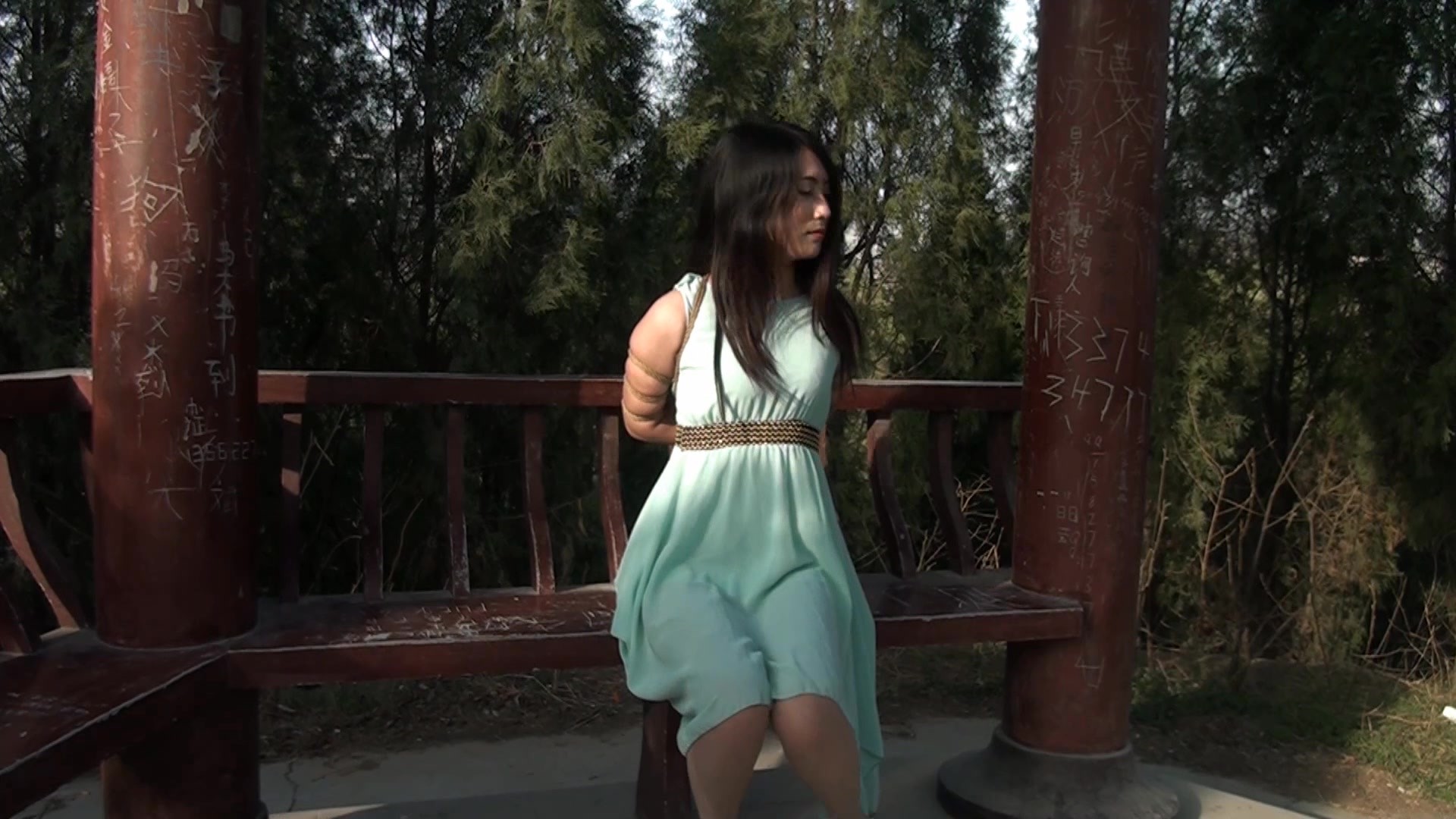 高挑美女的首部户外绳艺MV,在山林中的凉亭被五花捆绑展示绳艺,被捆绑着悠闲的走在林中小路中!