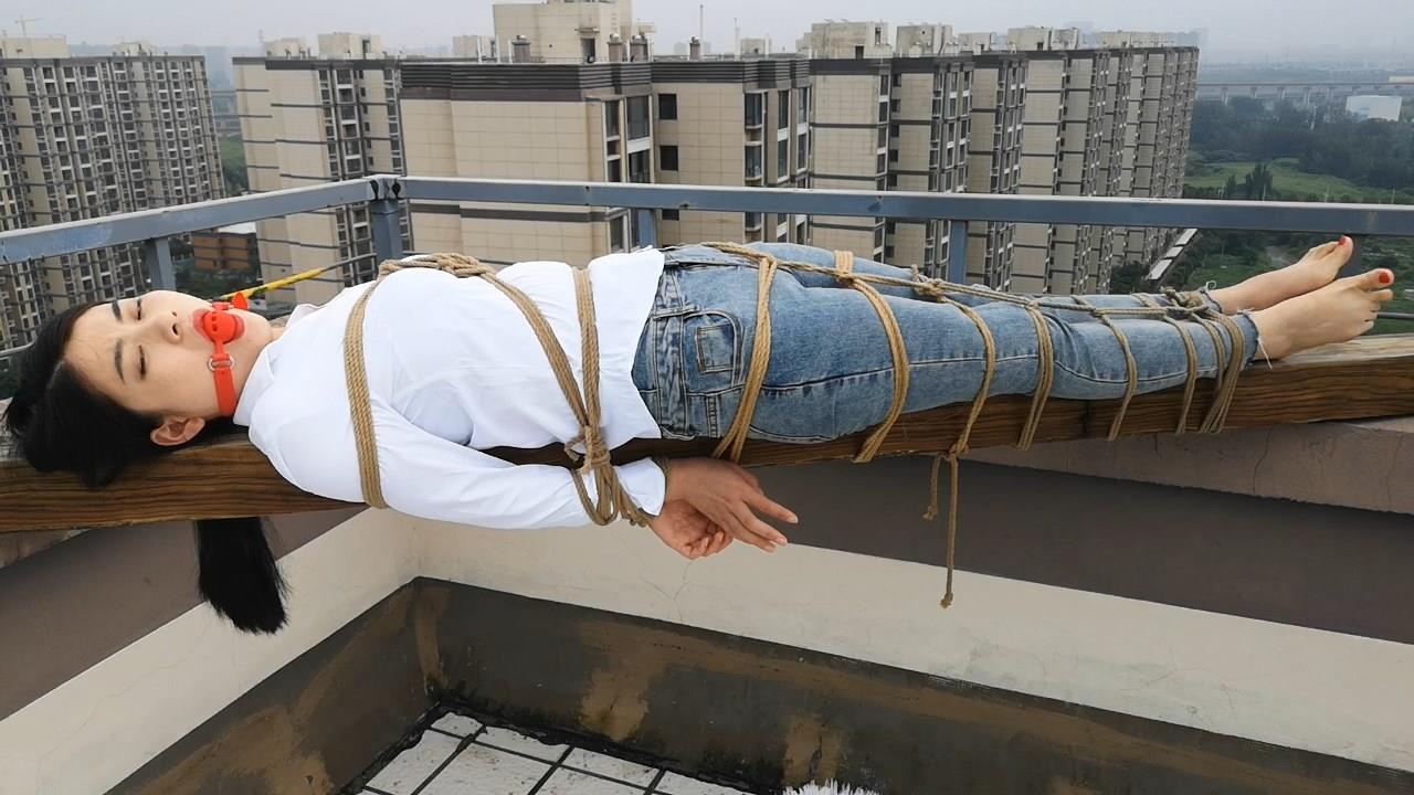 【随心原创】冷兮 白衬衣 牛仔裤 楼顶木头上的捆绑 手脚捆绑艰难的下楼梯