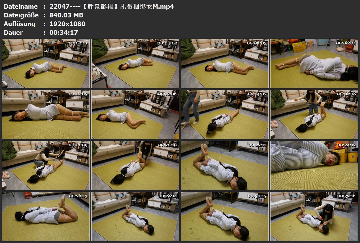 女M头被绷带包裹着,全身下上被扎带捆绑着,扎带可是比绳子捆绑难受的,请欣赏视频
