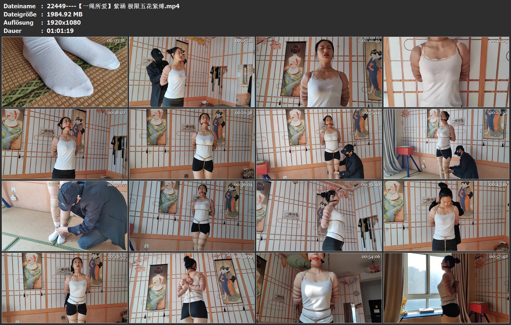 这是一个五花紧缚爱好者的订制作品,感谢大哥授权挂出。都知道紫涵耐绑,这个作品是非常紧的五花大绑,五花[X_X]紧绑,麻绳狠狠勒紧肉里的感觉,双腿也紧紧捆绑,大号口球堵嘴,特别严密的捆绑,紫涵被捆疼的不可言喻,来回走动