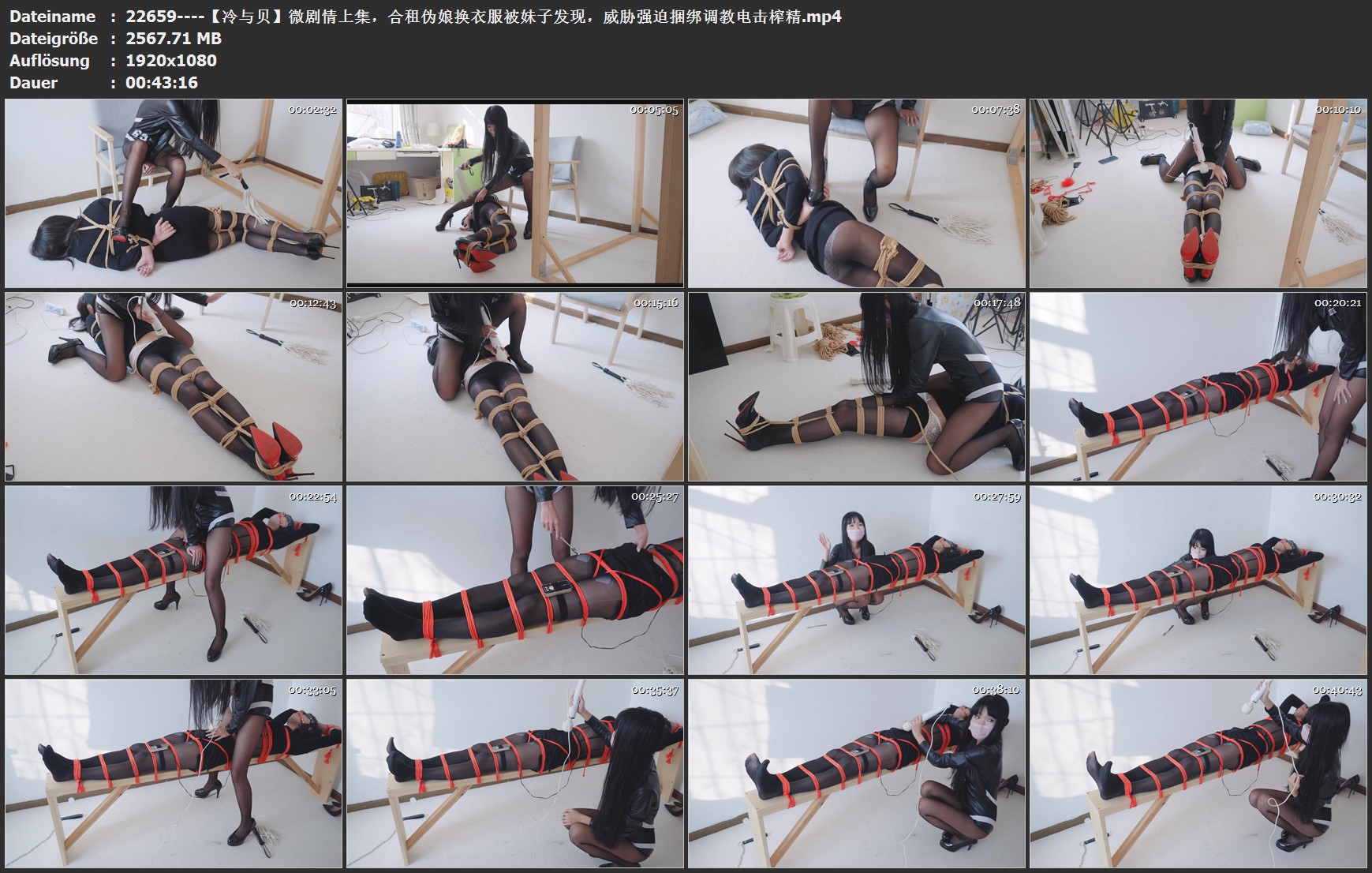 小九(伪娘)回家后偷穿女装,被合租的女生冷酱发现并且偷拍,事后冷酱用照片作威胁,逼迫小九接受捆绑调教,前半段为地毯上捆绑鞭打,高跟鞋踩踏,后半段将小九固定在长凳上,电击+ 震动榨精,最后成功榨精,把冷酱开心坏了hhh