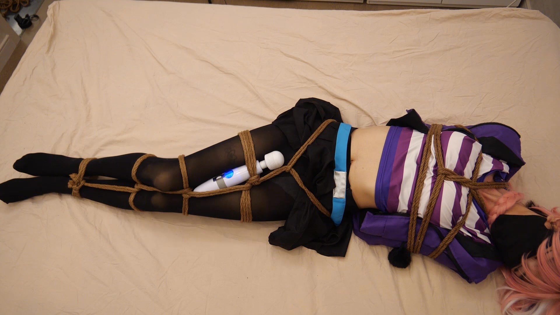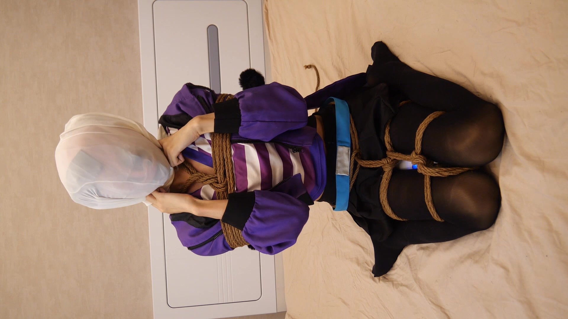 开始是就是被绑好鸭子坐,然后被说有点单调,就不知从哪里掏出来一个塑料袋...(可恶哦!摄影师!阿福的马尾辫不是用来当勒脖子玩绞刑的!更不是用来当塑料带封口的扎绳的!)虽然塑料袋的[X_X]感没有上次真空袋的那么强烈,也没有全身被紧包的舒适感, 但是也是比较难受的呢 ---毕竟戴着口罩本来呼吸就略微受阻的。