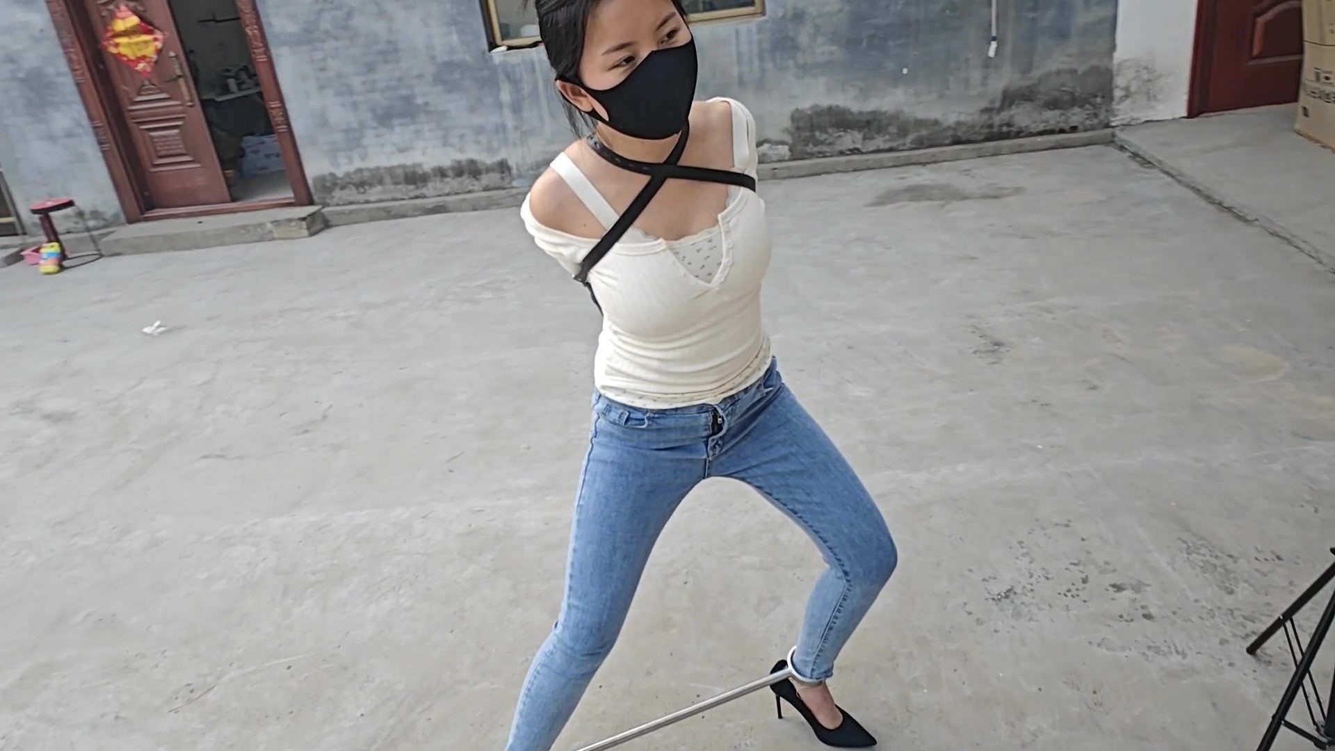 模特井百慧,今天拍的是 单手套 穿上高跟鞋 加分腿器行走,最终受不了 换下运动鞋,然后高手吊缚,难受的姿势