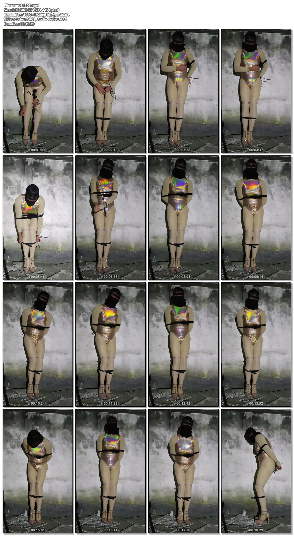 小沫穿的泳衣死库水紧身衣带着TD,嘴巴用口球堵着然后丝袜套头蒙上眼,胸口上和腿上都贴着电击贴片全程开到最大深夜温度零下3度加上高跟鞋12cm腿一直打哆嗦,用的定时锁自缚,到最后电的抽搐实在站不住了。