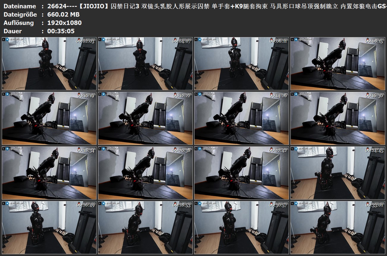 【JIOJIO】囚禁日记3 双镜头乳胶人形展示囚禁 单手套+K9腿套拘束 马具形口球吊顶强制跪立 内置郊狼电击GS+榨精乳胶电极片 外置震动B强制CG
