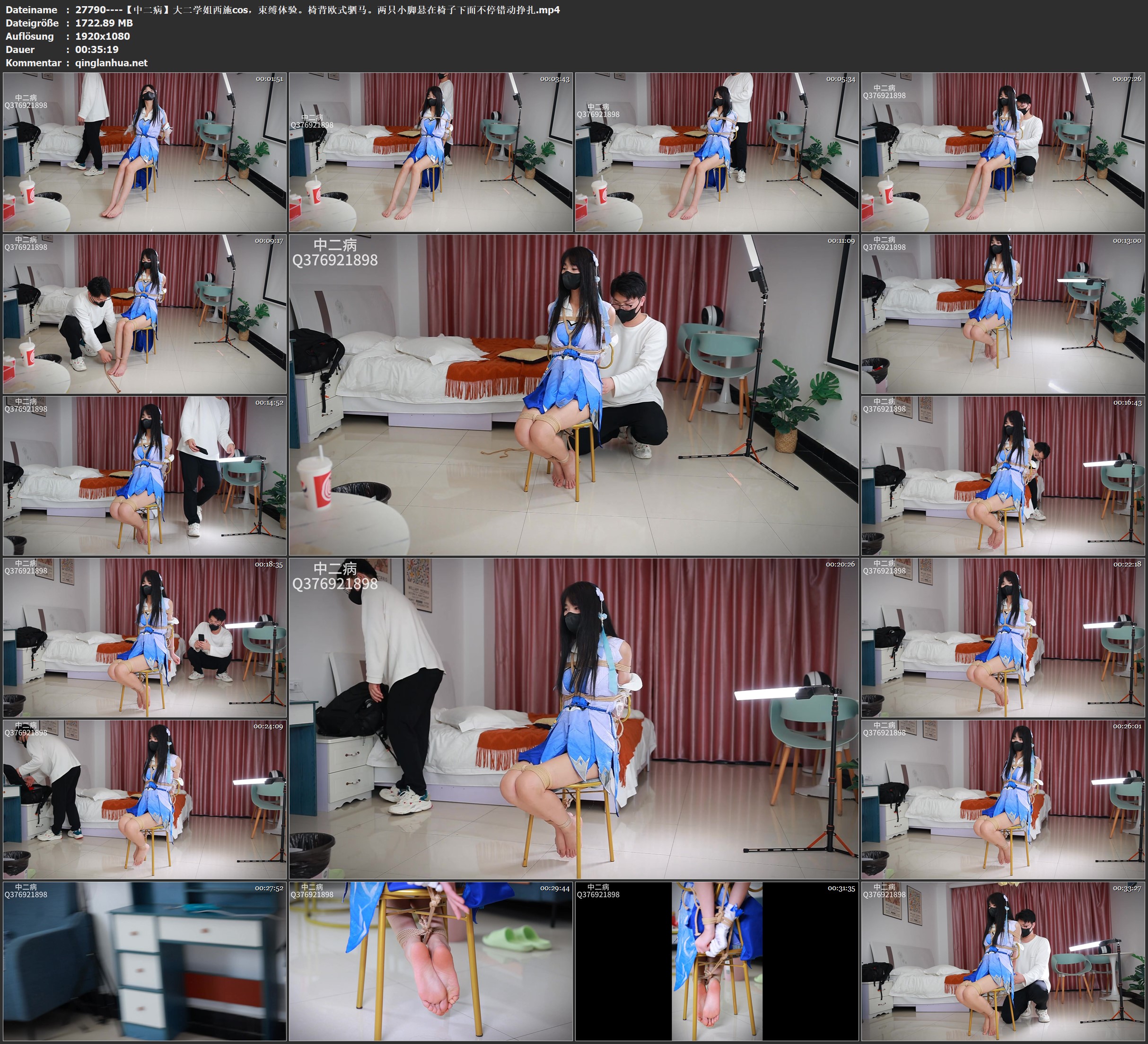 大二学姐西施cos,束缚体验。椅背欧式驷马。两只小脚悬在椅子下面不停错动挣扎