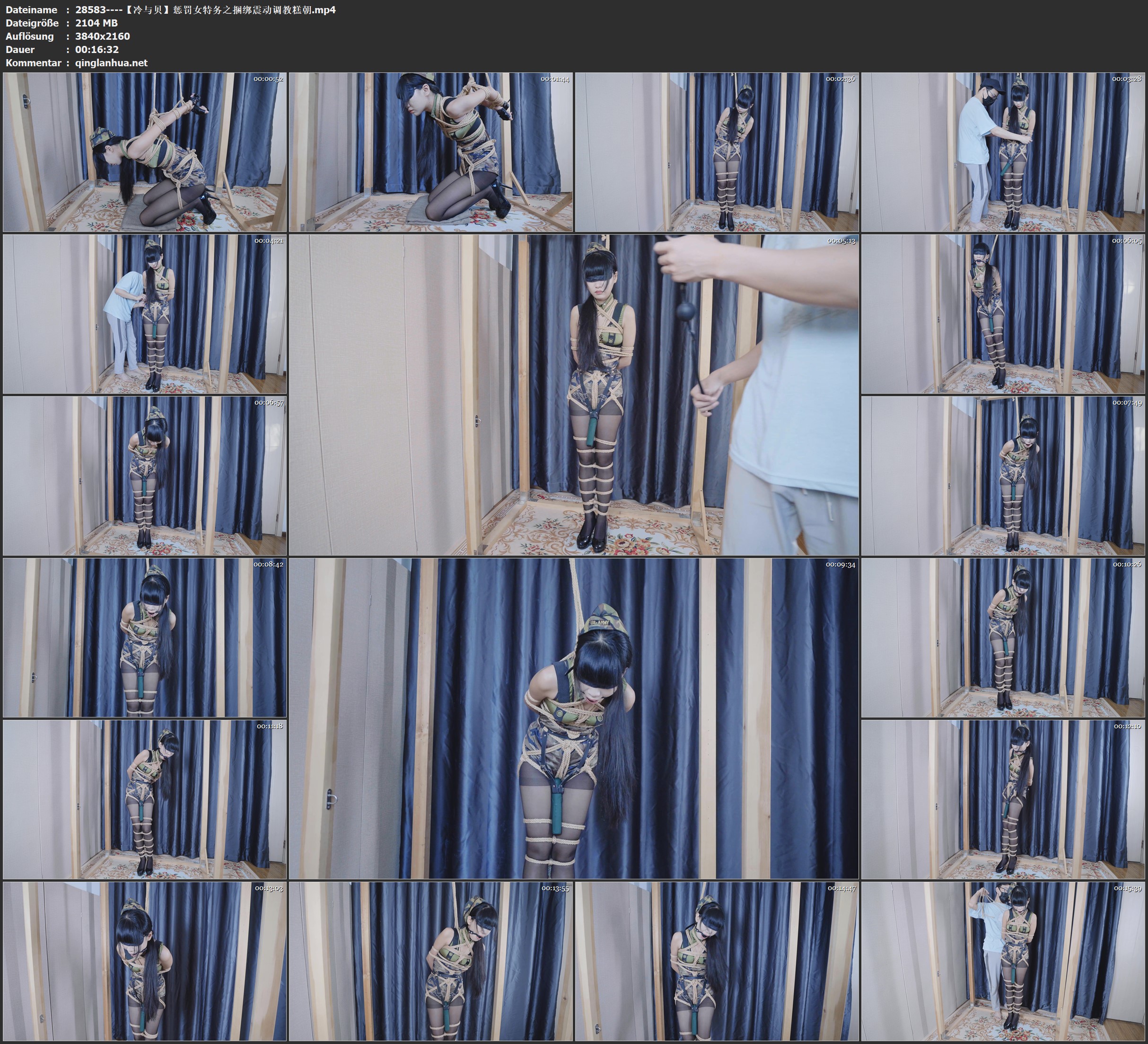 身着迷彩服的女特务被抓到,开幕就跪在地上,手臂在身后直臂吊高,使其趴不下,坐不直,处在一个不上不下的非常难受的姿态(本段时间3分钟),随后站立捆绑,双腿用绳绑好,用固定带固定好棒棒,给她戴上大号口球,随后打开震动梆棒,做完之后就可以欣赏女特务扭动身体和流口水了~调教持续到最后糕朝~