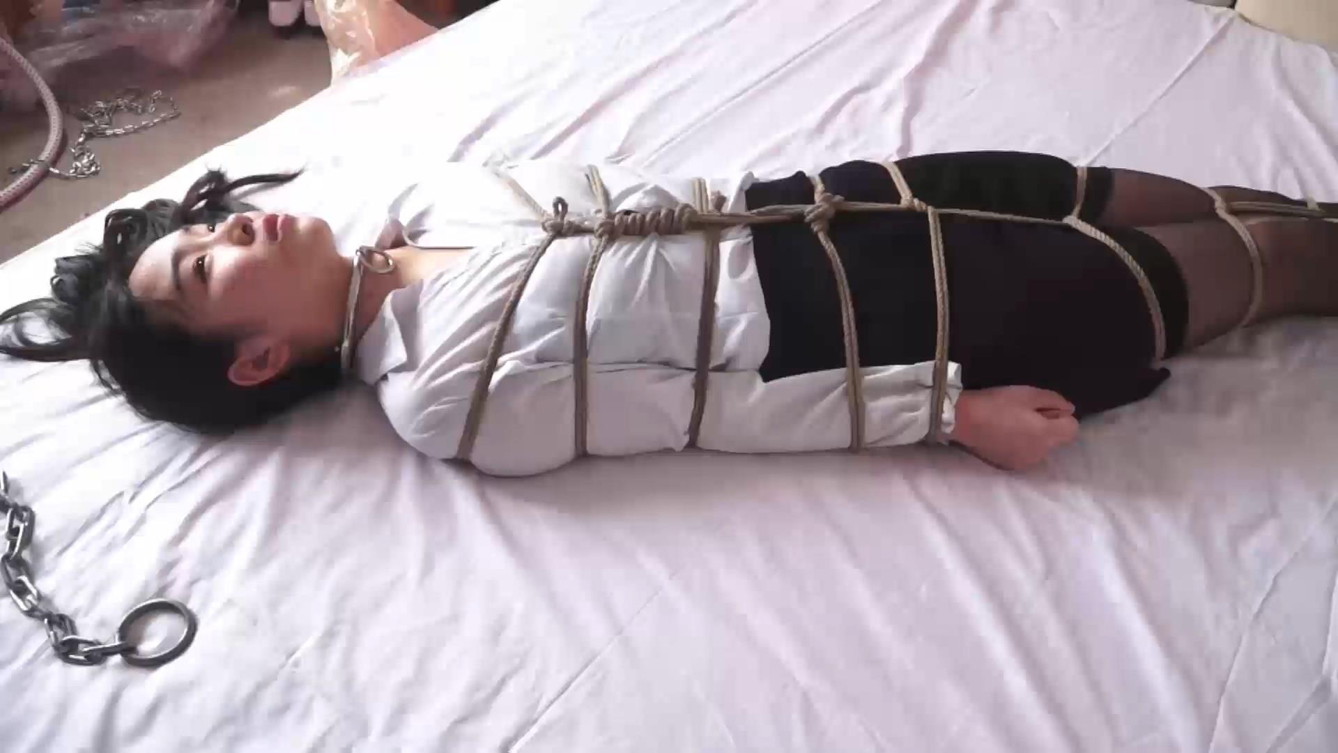模特双臂被绑在身旁,双腿交叉被绑,口球封口。再用锁链捆绑,带上项圈限制在床上,动弹不得......