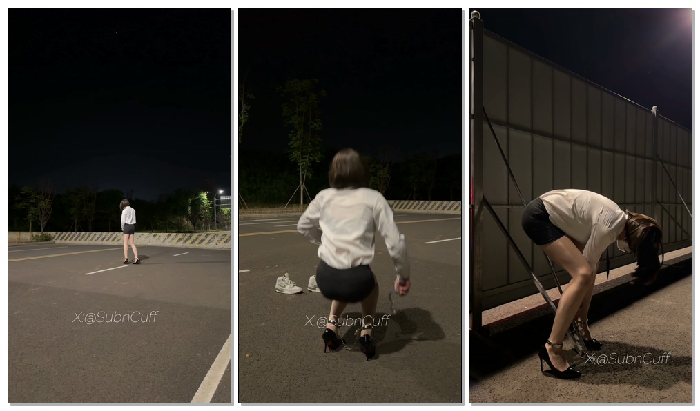 在一片彩钢板旁边先穿着AJ走了走 看起来比想象中要好 所以换上了高跟 之后又铐上了脚铐 然后正铐 最后又试着背铐在马路正中间行走