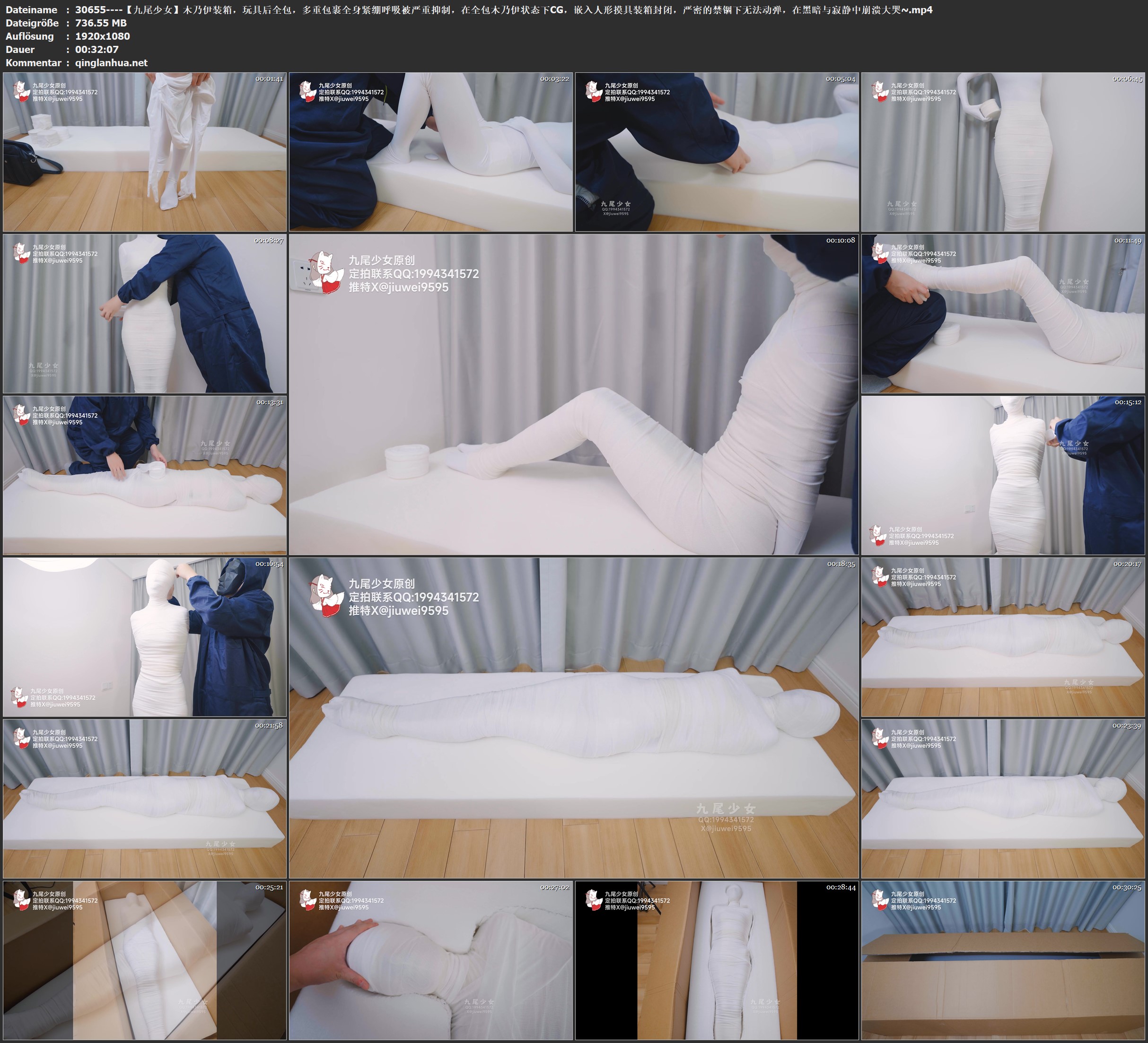 【九尾少女】木乃伊装箱,玩具后全包,多重包裹全身紧绷呼吸被严重抑制,在全包木乃伊状态下CG,嵌入人形摸具装箱封闭,严密的禁锢下无法动弹,在黑暗与寂静中崩溃大哭~