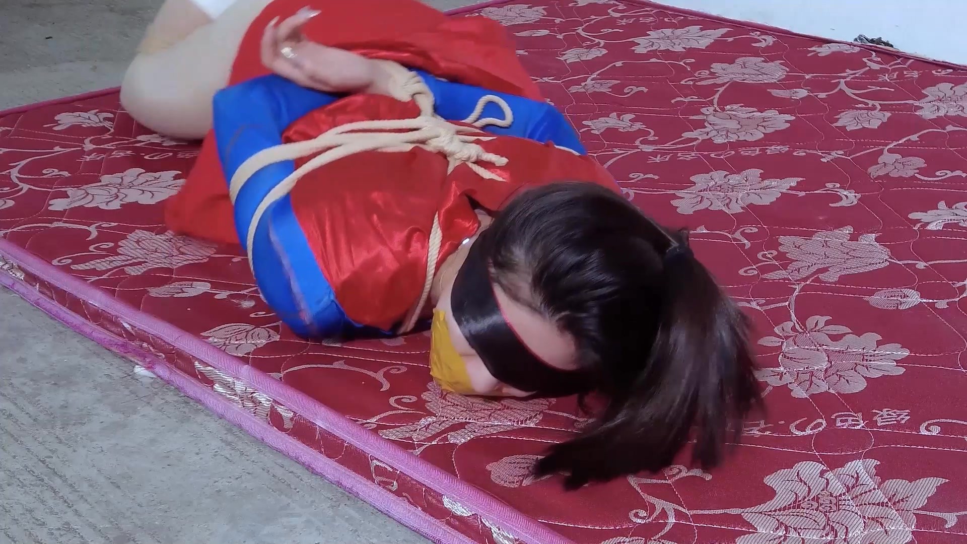 女超人来到外面(外景),“就是这里了”,走进房间,查看着四周,“这里怎么像迷宫一样”,突然冒出一股烟(特效),“不好,得赶紧离开”,女超人用胳膊捂住口鼻,转了两圈没找到出口,感觉脑袋昏昏沉沉,倒在地上,走出来一个人:“女超人果然上钩了”,拿出绳子将女超人用麻绳捆绑(日式,膝盖,脚腕),嘴被胶带贴住,眼睛被蒙住,过了一会,醒来,“嗯?”,开始挣扎,呜呜叫,挣扎好一会直到筋疲力尽,歹徒进来将其捂晕,“醒的真快,带进去吧”,将女超人扛走···待续
