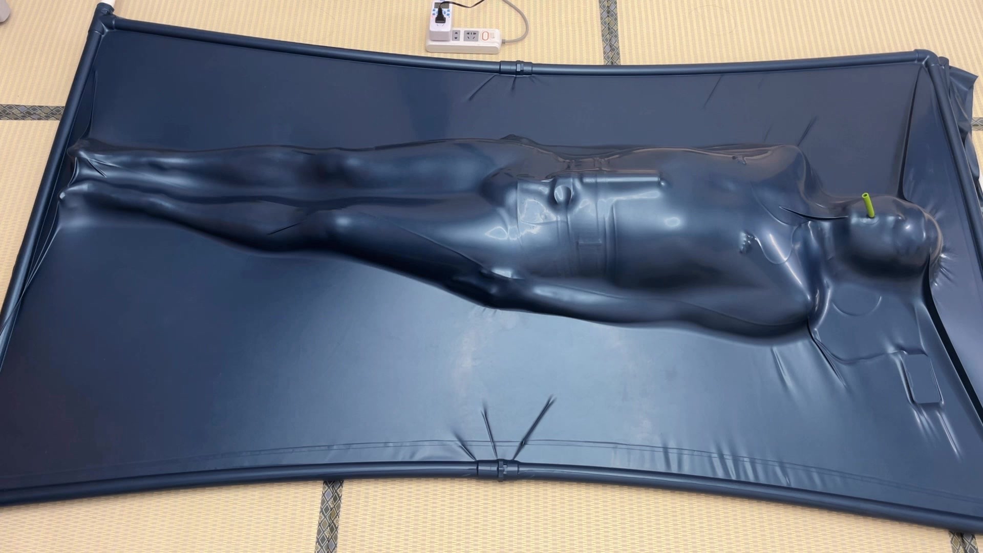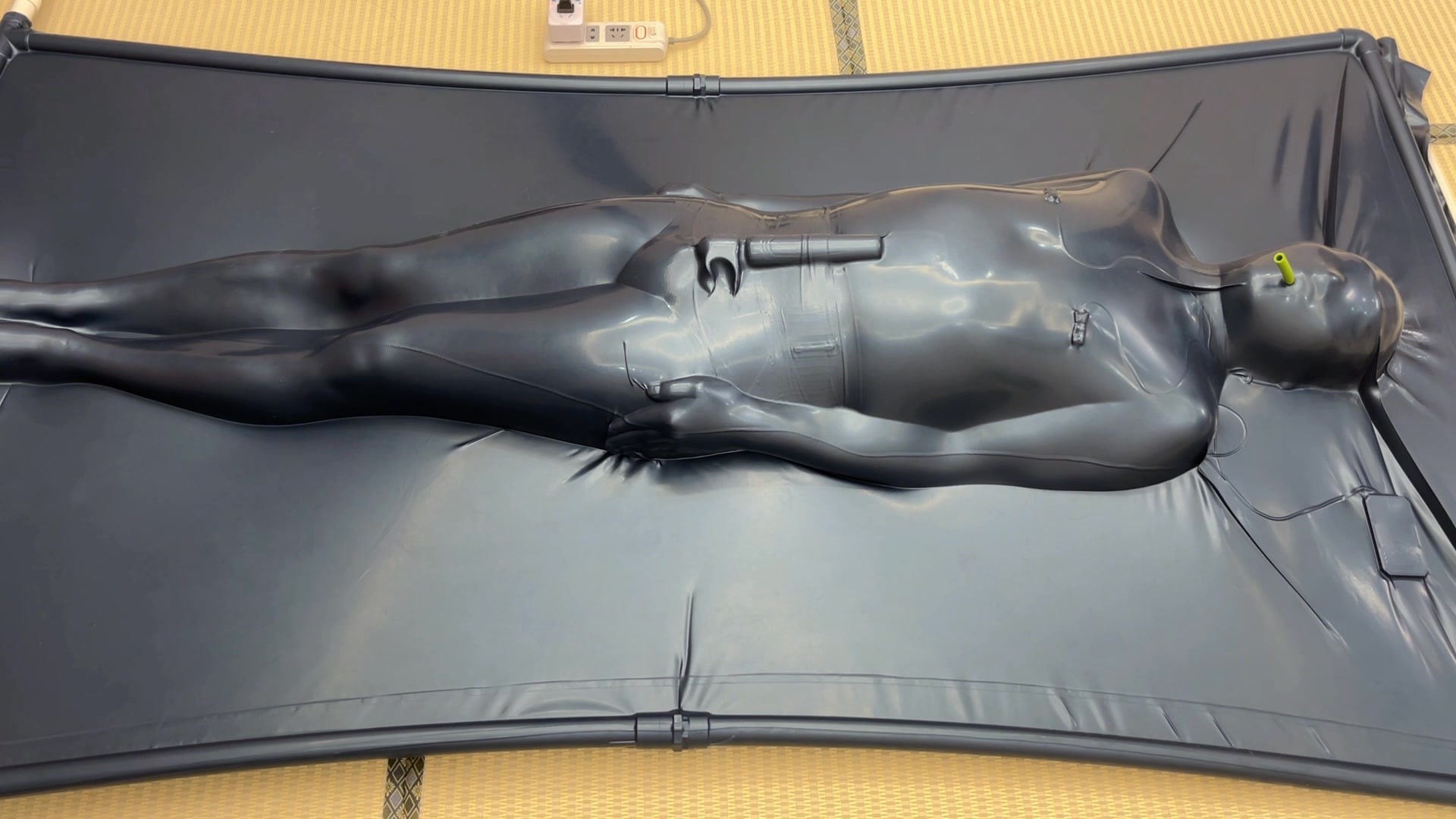 紧缚挣脱挑战;前期准备,首缚者需要佩戴三种干扰道具,并且穿上丝袜睡袋全包起来进入真空床,真空床会间歇每抽气10分钟停2分钟,受缚者需要在20分钟内逃出真空床,如果未能逃出或者在20分钟内被刺激到GC缴枪