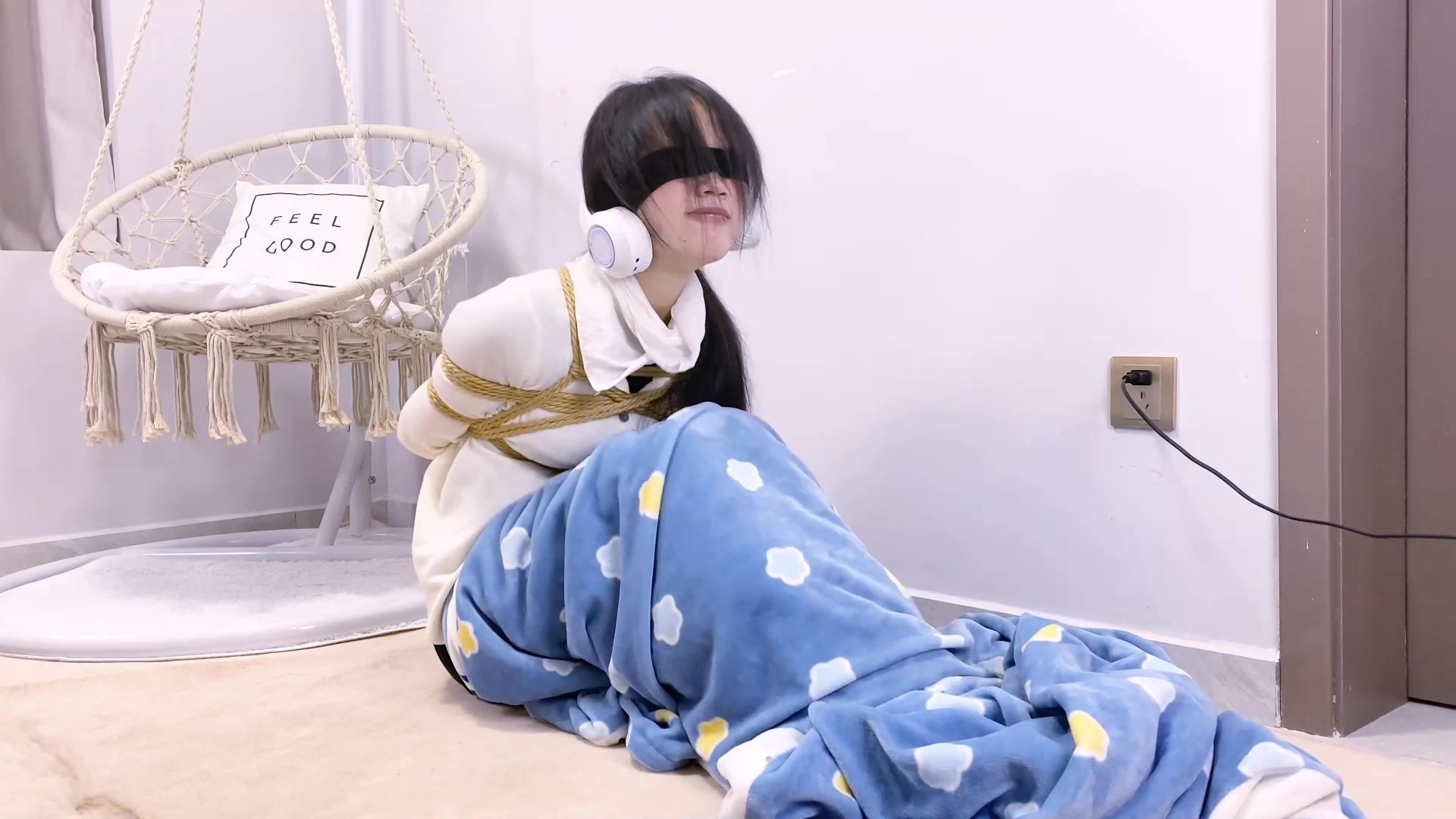 妹子被绑,坐在墙角,挣扎一会,然后给妹子戴上耳机,放一会音乐。然后拿毯子盖在她腿上,让妹子挣扎一段时间