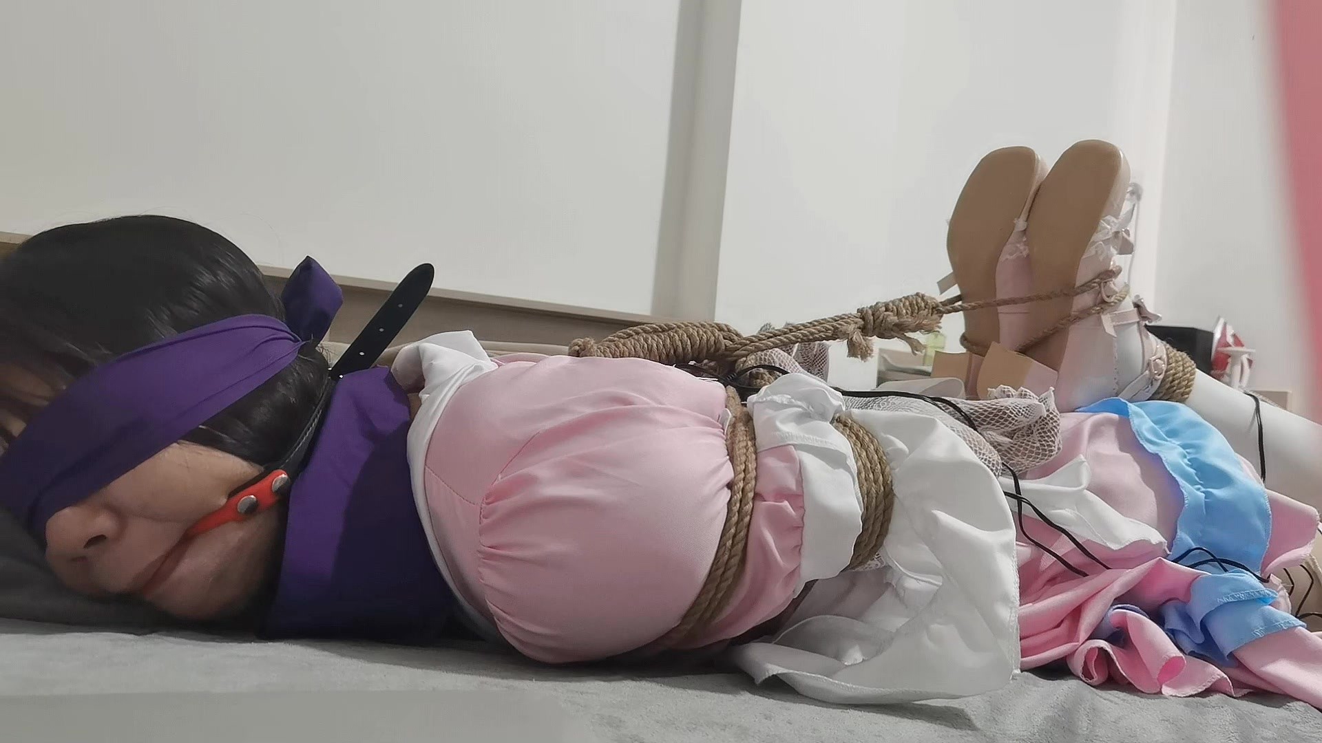 粉红色女仆服+白丝过膝袜+粉红色lolita小高跟,极限驷马拉紧,在床上无法挣扎动弹,[X_X]放置伺候玩得不亦说乎,郊狼电击惩罚,口球堵嘴,蒙眼|收音麦忘记开了所有没有声音~