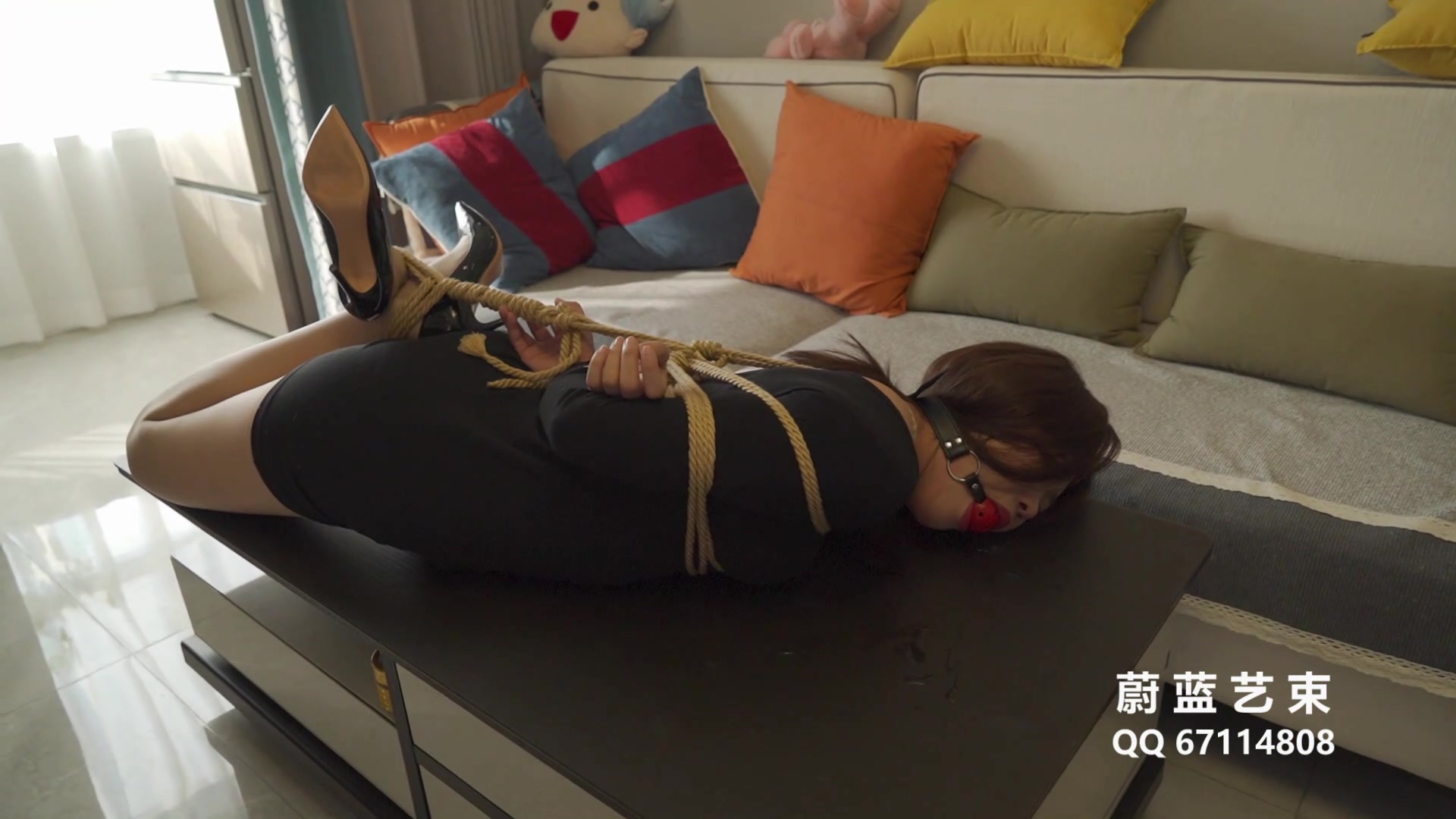【蔚蓝艺束】小羊 口枷佩戴 黑丝勒嘴 丝袜嘟嘴胶带封嘴惩罚 驷马紧缚 绳子牵引头发