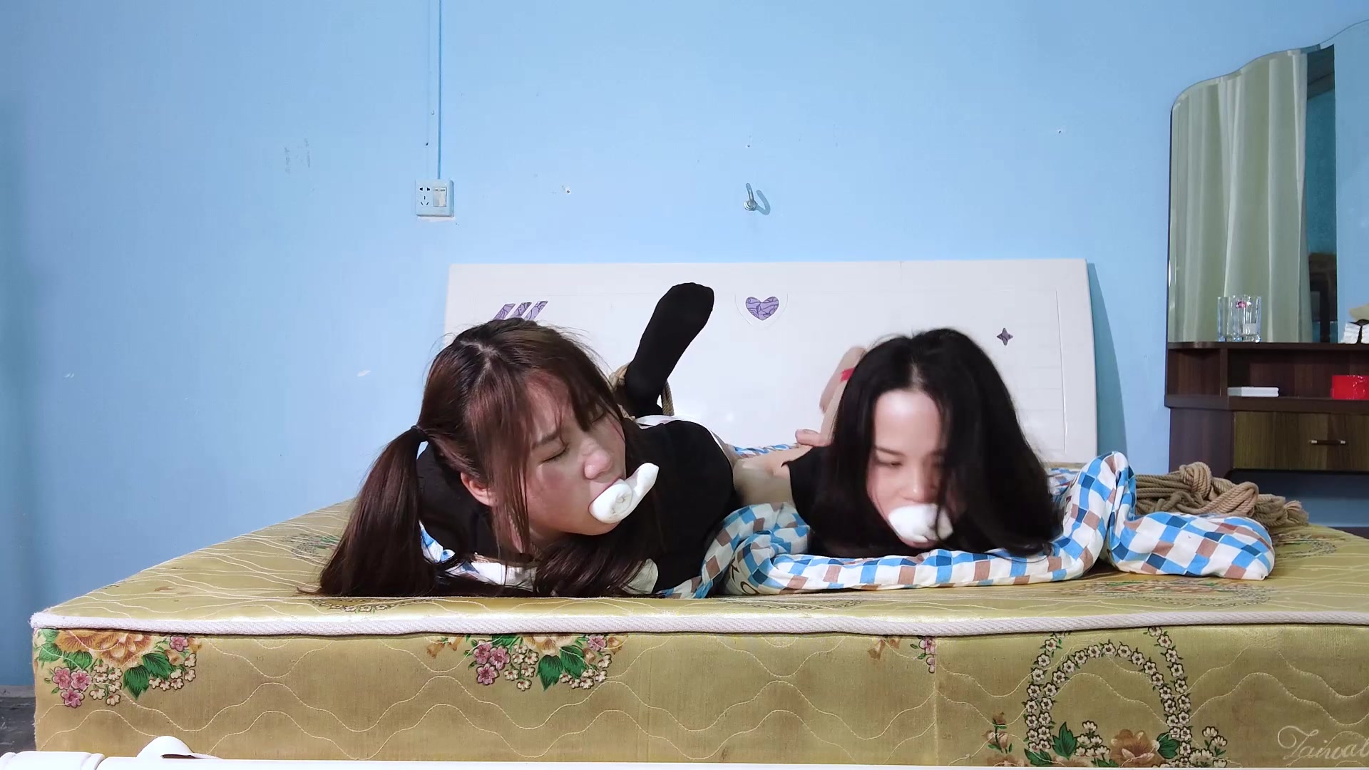 两人相互咬掉嘴里的棉袜,姐姐用嘴帮妹妹解开手上的绳子!妹妹帮姐姐解开手上的胶带
