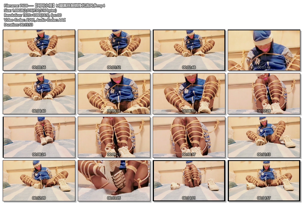 双腿被紧紧地捆绑,满满的羞耻感,口水忍不住的从嘴里流出来,最后衣服被口水打湿了。如果喜欢口球的不要错过。
