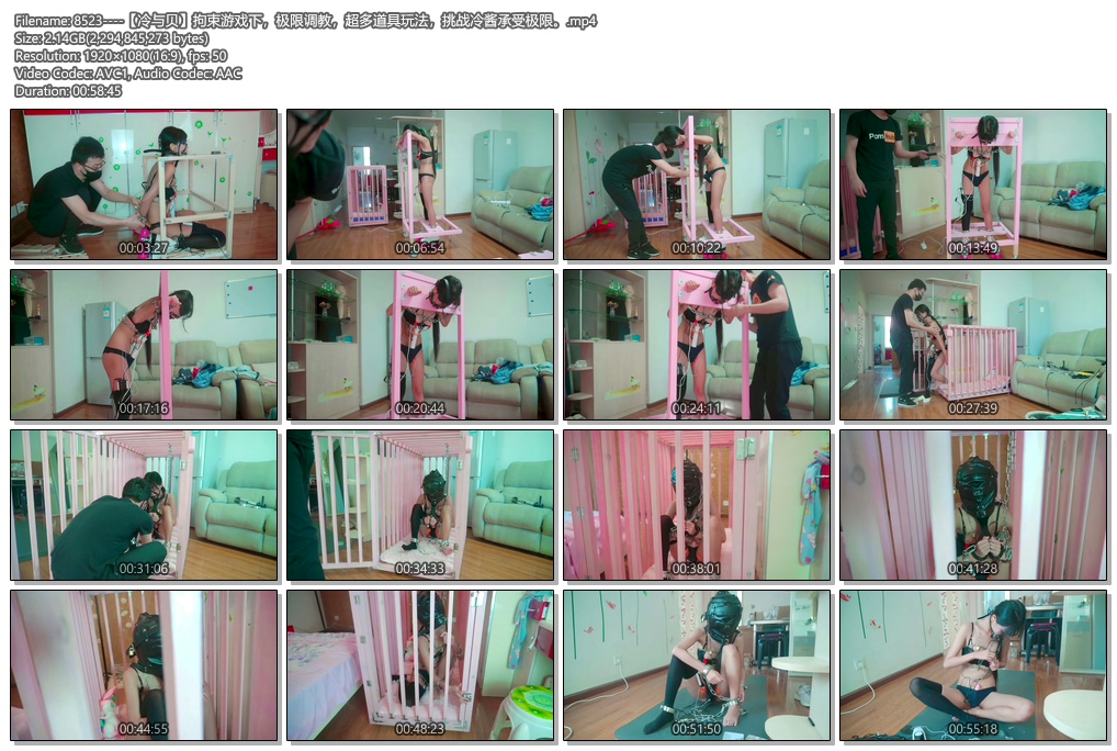 下集,接了上集一点镜头,冷酱全身拘束从桌子拘束架上放出来后,固定在站着的木枷上,双手另外戴手铐,双脚另外戴两幅脚铐,进行鞭打,大约50鞭后打开电击器开关,80鞭后增加电击强度,最后再打20鞭。从站枷上放下来后脱掉轮滑鞋,戴上耳塞,套上头套上锁,并且告知她会锁起来她全身,钥匙在一个铁盒里,铁盒在门口前的垫子上,给冷酱戴上颈手枷,脚:重铐丶环铐(都带链上锁)手:重铐在枷下(大锁直接锁),环铐、O型铐在枷上。枷:普通锁,钥匙就放面前地上,但是由于定时锁链接不能俯下身子拿到为标准,进笼:坐靠里位置→笼顶垂下粗链,把链条用定时锁锁在手环铐链条上(长度控制在让你不能前移,不用绷太紧)。定时10分钟,T蛋丶R夹丶A微棒丶电击片电源开大档,关上笼门,笼门下面的板扣用大锁锁。把笼门钥匙放在笼子里笼门旁。把木笼推进卧室里。各角度拍。3、定时10分钟后:打开颈手枷→打开笼子门,爬行移动到大厅防盗门口→从铁盒里拿钥匙自行开锁→解除所有拘束和性器具后结束。